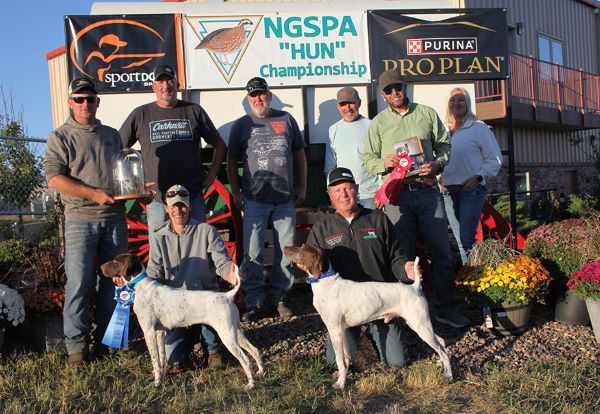 NGSPA Hungarian Partridge Open Shooting Dog Championship Winners (Upper l-r): Chris Bryant, Josh Nieman, Mick Cheshire, Andy and Becky Dynkiewicz, and Dan DiMambro. (Lower l-r): Rich Robertson Jr., Reston Haberkorn, and April DiMambro.