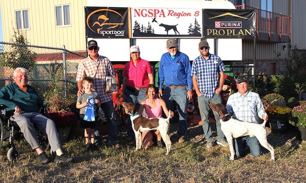 NGSPA Region 8 Amateur Shooting Dog Championship Winners (front, l-r). Brandon Blum with Aunt Troji's Dirty Nike and Sherri Tangsrud with Uodibar's Robbi Jo. (Behind): Larry Metter, Howard Burbach, Kirk Loftin, and Lisa Pollock.