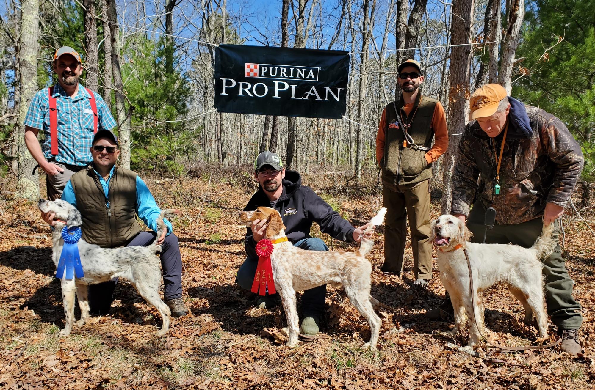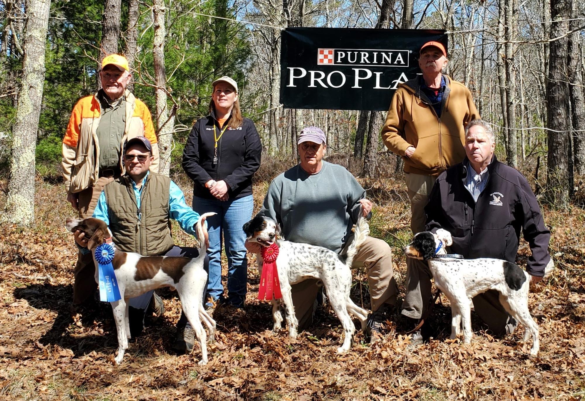 Frankie McLaughlin Amateur Shooting Dog. James LeVesque with Ledge Hill Chippewa, Jim Hathaway with Wizard's Cas Dubh, Tim Cavanaugh with Hog Hill Katie, Judge Jamie Nee.