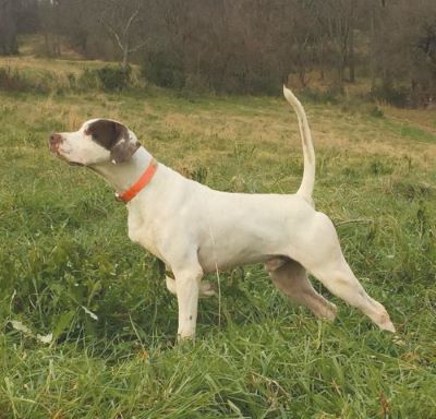 Bully Rock, a white and liver pointer male owned by Muriel and Bill Primm and Karen and Ernie Saniga, garnered third place. Bully Rock was handled by Mike Tracy and ran in brace No. 21. Bully Rock ran an industrious race and was business for the full 60 minutes. He scored finds at 9, 32, and 43. Point was called for Bully at 15, but a group of wild piglets was seen leaving the area, so he was taken on. He finished the hour in Phelps Bottom, still hunting and moving forward.